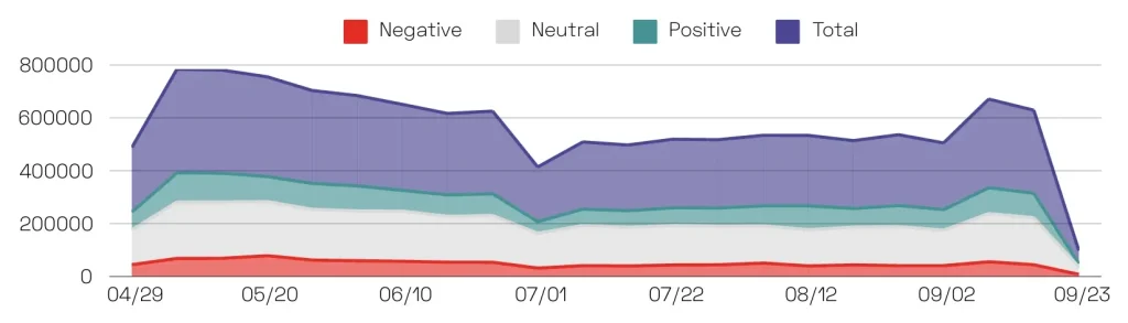 We monitored conversations from May to September 2024, and mentions of AI on social media skyrocketed, reaching over 1.1 million mentions—nearly doubling the volume from 2023 (504,037) and quadrupling 2022 (281,893).