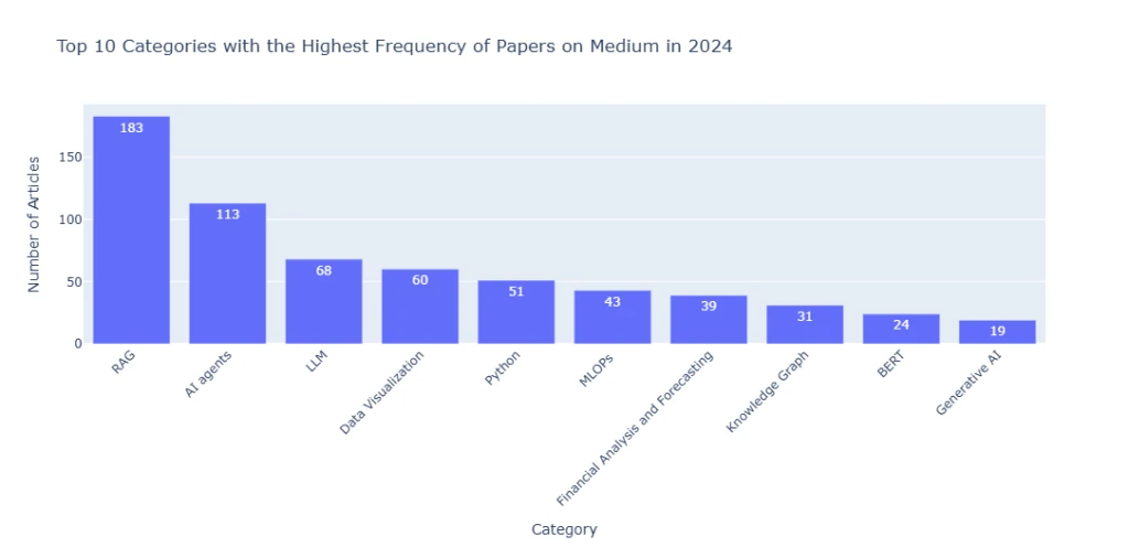 In 2024, what emerges is an ecosystem in transition. The initial phase of fascination with generative AI has passed, and the focus has shifted rapidly toward a very concrete problem: how to turn LLMs into useful, reliable, and production-ready systems? This shift appears clearly in the distribution of categories. “RAG” emerges as the most frequent theme of the year, surpassing by a wide margin terms such as “LLM” or “Generative AI” (Figure 1). This data point alone is revealing. it indicates that the debate was no longer centered on the ability to generate text, but rather on how to connect models to verifiable knowledge, reduce hallucinations, and incorporate real-world context into responses.