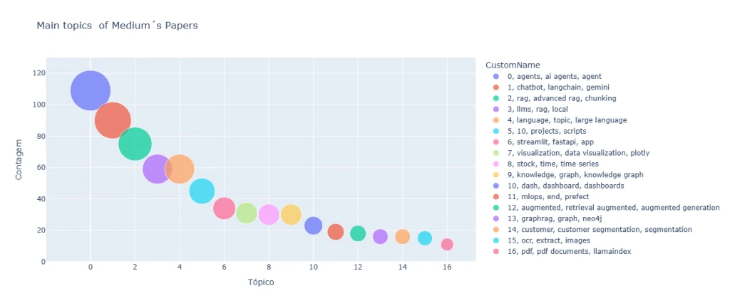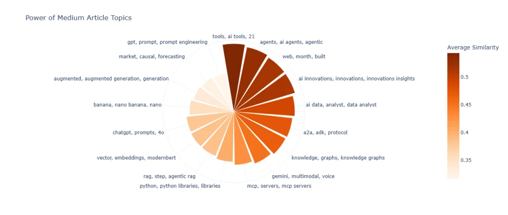 Taking a more detailed look, the topics with the highest average similarity are: (1) chatbots + LangChain + Gemini; (2) language, topic, LLM; (3) projects, scripts; (4) PDF, documents, LlamaIndex; (5) knowledge graphs; (6) AI agents; (7) data visualization; (8) local LLMs, RAG; (9) GraphRAG; and (10) Streamlit, FastAPI, and apps. This shows that, despite some fragmentation, the articles exhibit an implicit consensus around a common “stack,” which can be interpreted as a signal of technological consolidation.