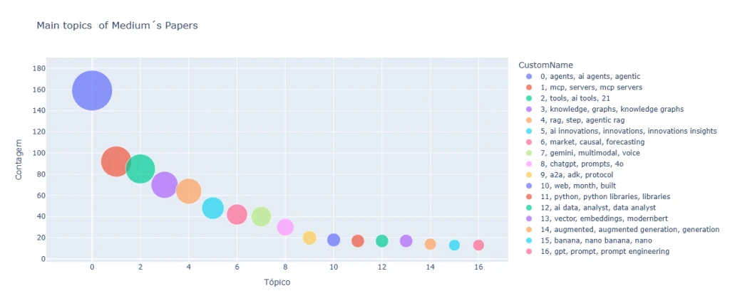 Why is Medium such a compelling thermometer? Because it operates as an instrument that allows us to measure two things: (1) what the technical community is actively trying to build at the moment (tutorials, guides); and (2) what is being adopted and standardized (frameworks, protocols, and “stacks” that reach consensus). By analyzing article titles, for example, it becomes possible to capture signals of intente, what people are investing time in learning, teaching and replicating. This is extremely useful for identifying trends, especially in software engineering and AI. That is exactly what was done. By analyzing 1,734 article titles published between 2024 and 2025, previously categorized and processed using topic modeling, it was possible to conduct a particularly insightful archaeology of how the discourse around AI has matured and, from that, to project trends for 2026.