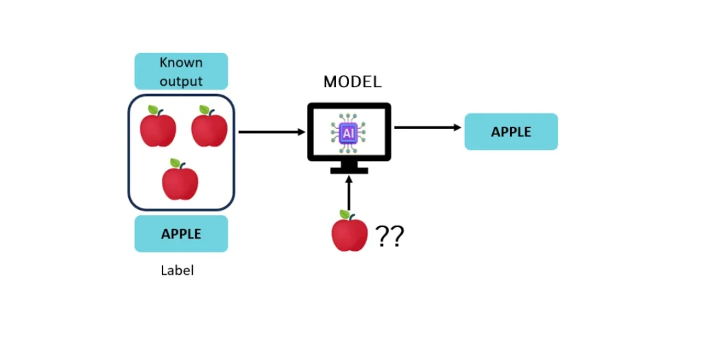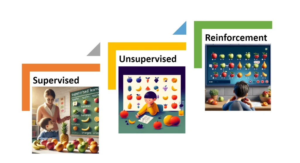 - Supervised Learning: In this type, a machine learns from labeled examples, much like a student learning with guidance from a teacher. The child learning to read and the teacher shows examples of different fruits and how to spell each one.