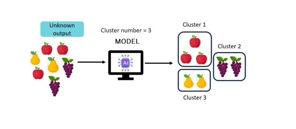 One of the great advantages of unsupervised learning is precisely the discovery of unknown patterns and the synthesis of a large volume of data. For example, you can pass several images of fruit to a clustering algorithm without providing any labels. All you need to indicate is how many data clusters you want. By providing this amount, the algorithm will calculate the similarity between the fruit images, labeling those that are similar with the same cluster number.