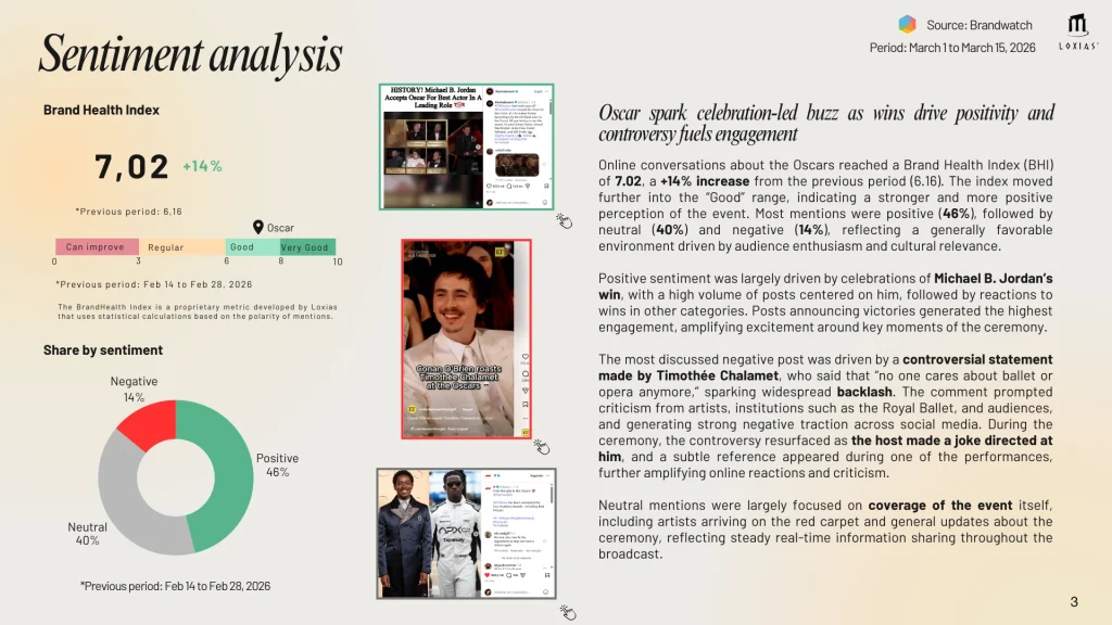 The general sentiment toward the ceremony was favorable. The event reached a Brand Health Index of 7.02, representing a 14% increase compared to the previous period, placing the Oscars firmly within the “Good” perception range.