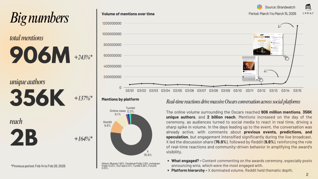 A recent analysis of online conversations between March 1 and March 15, 2026, reveals how audiences interact with the Oscars in real time, what moments drive engagement, and which films and personalities capture the most attention. The data shows that the Oscars are not just a television broadcast. They are a distributed digital event, where audience reactions unfold simultaneously across multiple platforms.
