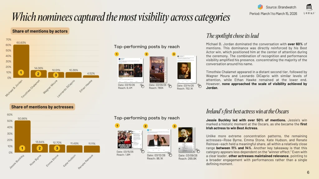 The analysis also reveals a powerful phenomenon: the winner effect. When awards are announced, attention rapidly consolidates around the winning individual or production. Recognition instantly translates into visibility dominance. For example: Michael B. Jordan captured over 60% of actor-related mentions, following his Best Actor win. In the Best Director category, Ryan Coogler led the conversation with nearly 59% of mentions, significantly outpacing other nominees.