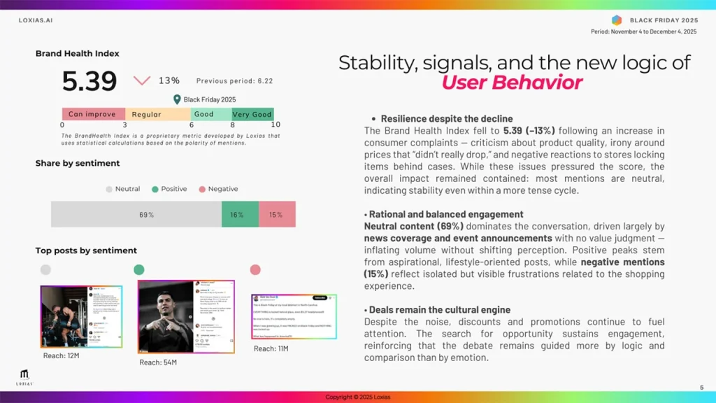 Black Friday 2025 registered 1.9 million mentions, 739.8 thousand unique authors and 6.3 billion in reach. This growth represents a significant increase from the previous period, driven by creator-led content, brand campaigns and cultural triggers such as gaming announcements.