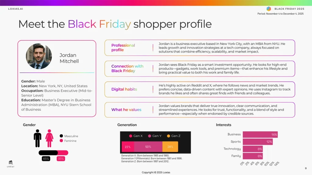 This persona is fictional, yet grounded in aggregated data about gender, age, job function, interests and digital habits. It helps translate demographic signals into a clear understanding of who drives Black Friday conversations.